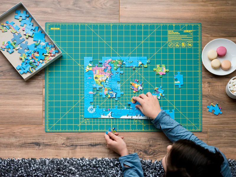 The OLFA RM-SG 18" x 24" Green Double-Sided Rotary Mat keeps your table or workbench safe so you can sew or craft with peace of mind. The Double-sided feature of this rotary mat shows yellow grid lines on one side for precision cutting, solid on opposite side for general cutting. Not only does this OLFA self-healing cutting mat have a long life, but it also extends the life of your rotary blades, too.