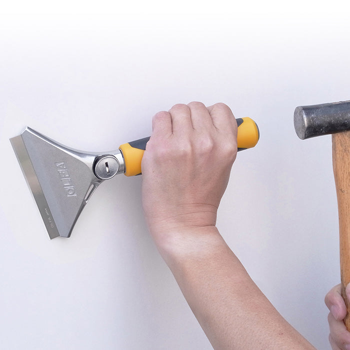 X-design 200MM-long professional heavy-duty scraper comes equipped with the 100MM-wide X 0.8MM-thick blade. No tools are required for blade replacement. The 0.5MM-thick BS, Flexible BSF and OLFA LB blade fit as well.